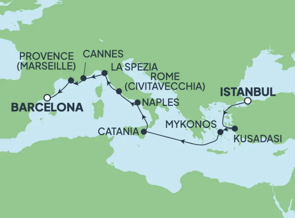Fedezze fel a Földközi-tenger legszebb városait a Norwegian Pearl fedélzetén! Az utazás Isztambul varázslatos világában indul, majd Kusadasi ókori kincsei és Athén mitológiai öröksége várja. A tengeren töltött nap után Szicília pezsgő hangulata, Salerno és Róma történelmi csodái következnek. La Spezia kaput nyit a festői Cinque Terre falvaihoz, míg Cannes és Marseille a francia Riviéra eleganciáját, valamint Provence ízeit kínálják. A kaland Barcelonában ér véget, a mediterrán kozmopolita fővárosban.