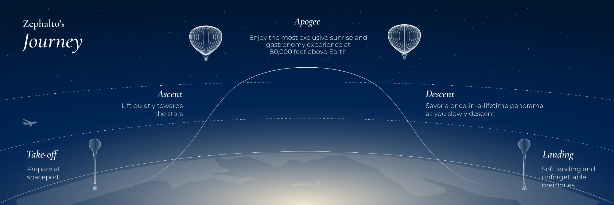 A teljes élmény kb. 6 órás, ebből nagyjából másfél órát tölt a ballon az emelkedés legmagasabb pontján. Ne repülést, inkábba lassú lebegést képzeljünk magunk elé motorzaj, G-terhelés és szkafander nélkül. A leírhatatlan látványt nyújtó út öt részből áll: